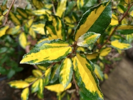 De Osmanthus tricolor is een halfhoge tot hoge compact groeiende struik. Het blad is geel-bont.
